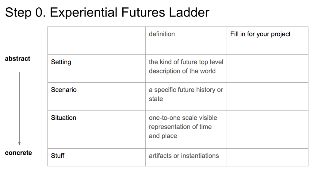 In the Experiential Futures Assignment you are using the Futures Ladder to go from: (a) abstract futures setting, (b) specific scenario, (c) a situation, and (d) specific artifacts so that people can experience your future.