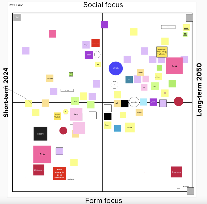 Let us imagine one axis that has “form” on one extreme and a “social” impact on the other. Put one post-it note where you would position your design practice on the vertical axis, in the short-term with regards to “form” or “social” focus? Write your name on it. Let us imagine you have a long design career. Where would you position yourself in the long-term, say year 2050, with regards to “form” or “social”?